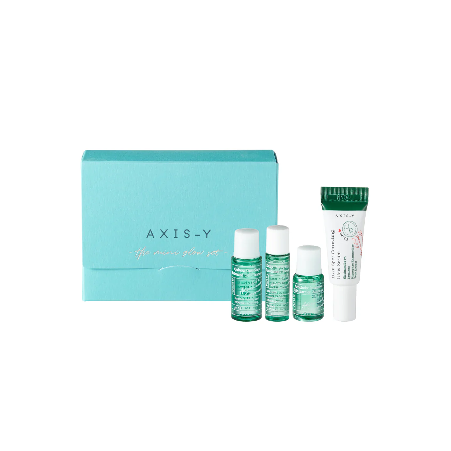 Axis-Y The Mini Glow Set is a travel-friendly skin care kit made to give clear, fresh, and glowing skin. This mini set is perfect to try the brand or gift someone special, with gentle daily care from cleansing to glow support.