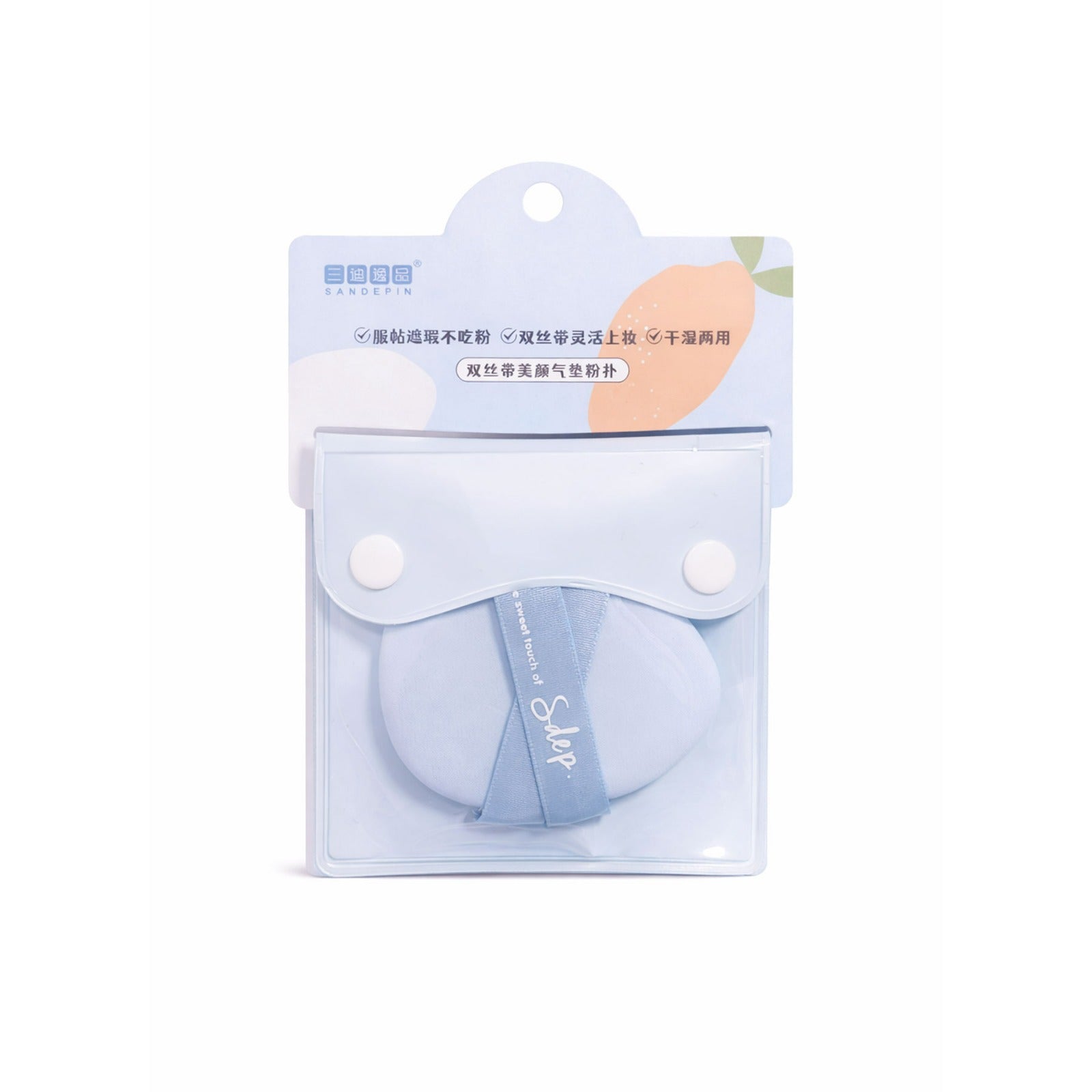 · Press the puff into powder or liquid product and gently tap onto the skin. Use light pressing motions to blend and set.