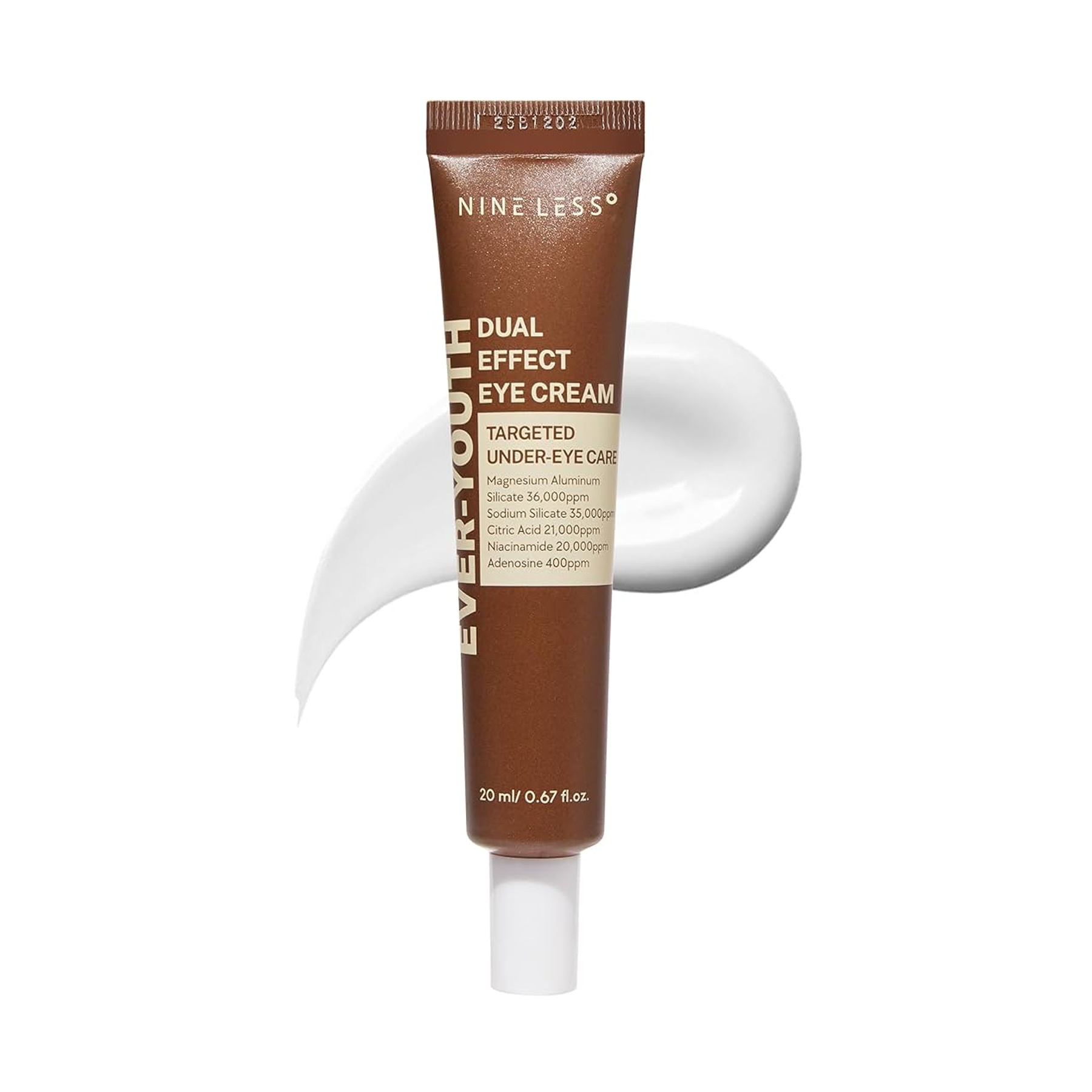 Nine Less Ever Youth Dual Effect Eye Cream is designed to target the delicate under-eye area. It helps reduce wrinkles, firm skin, and brighten dark circles while keeping the skin hydrated and refreshed.