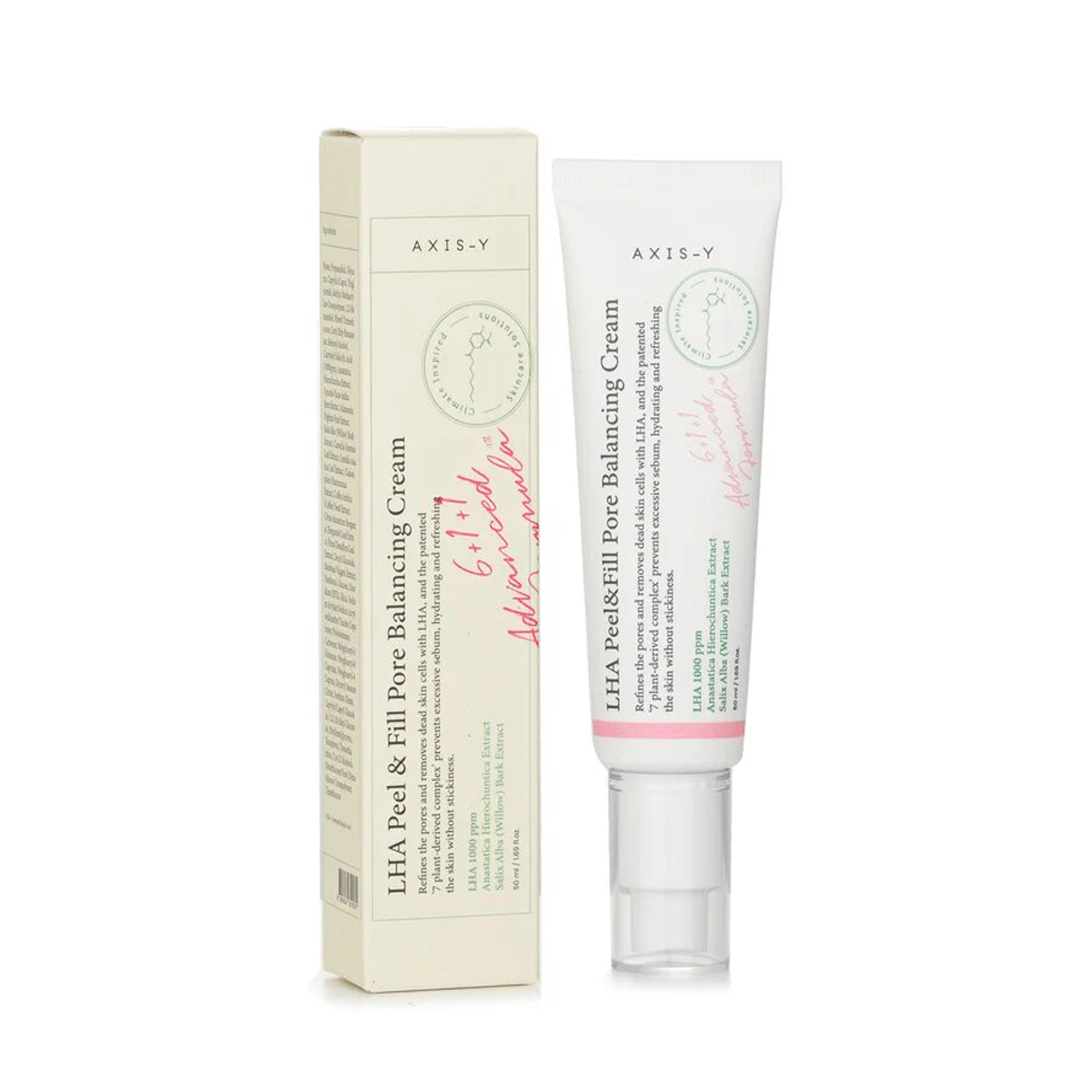 Axis-Y LHA Peel & Fill Pore Balancing Cream is a daily cream designed to gently exfoliate dead skin cells, control sebum, and minimize pore appearance, leaving skin smooth and refreshed.
