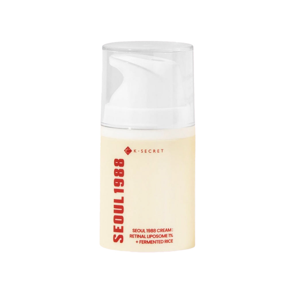 K-SECRET Seoul 1988 Cream: Retinol Liposome 1% + Fermented Rice is a luxurious cream enriched with 1% Retinol Liposome and Black Ginseng that targets fine lines, improves skin texture, and provides deep hydration. This anti-aging cream delivers a radiant complexion while addressing wrinkles, skin elasticity, and overall skin health.