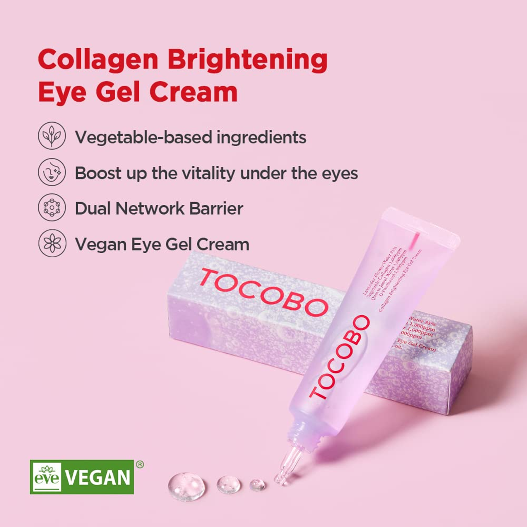 Tocobo Collagen Brightening Eye Gel Cream is a gentle vegan eye cream made with 81% lavender flower water that helps reduce dark circles and puffiness. It contains plant-based collagen, retinol, and panthenol to keep your eye area smooth, hydrated, and bright.
